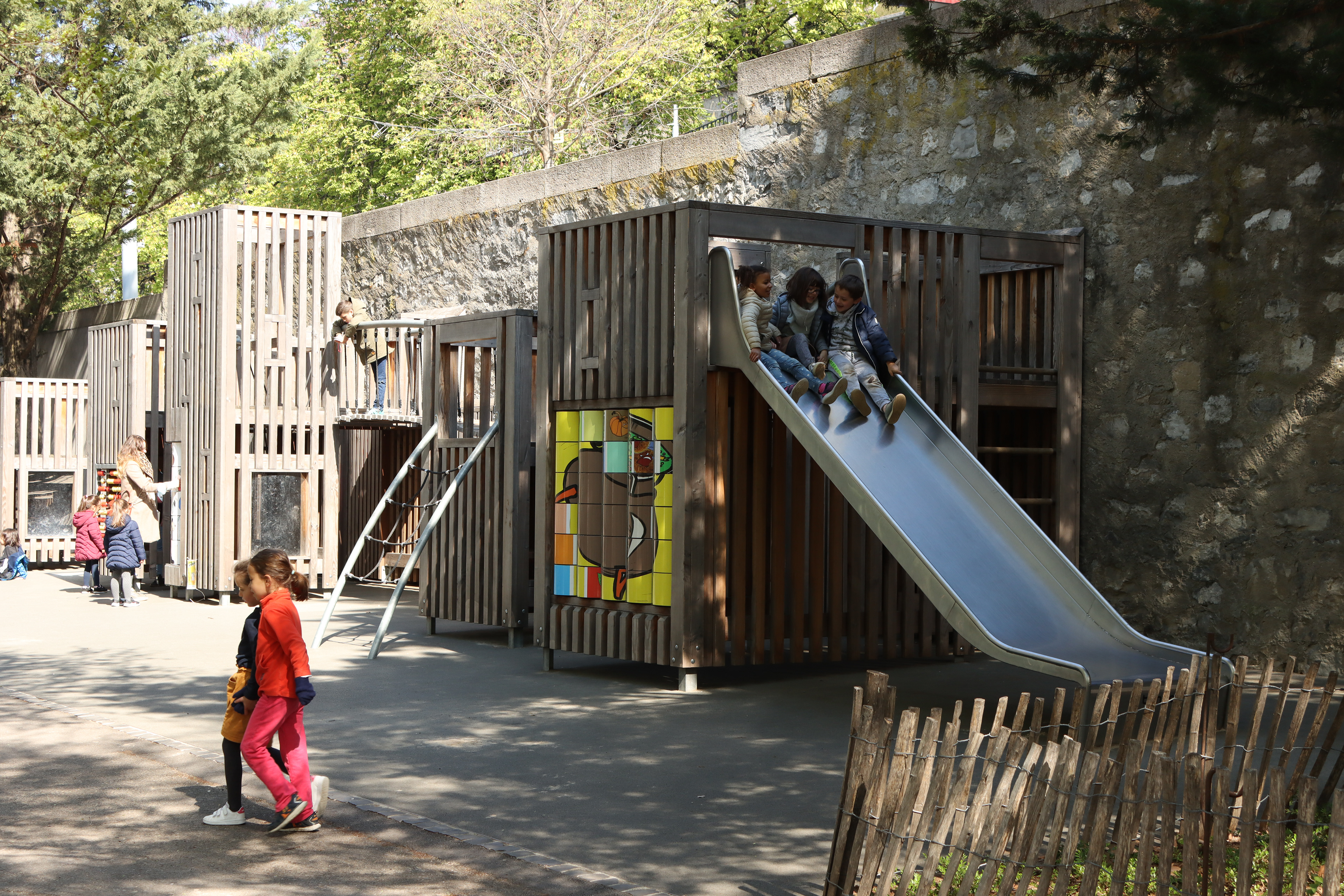 Le mur à jouer, accolé au mur historique de l’Escalade, prend la célèbre bataille pour thème et propose des activités semblables à son prédécesseur. Il est accessible à tous les enfants, avec des jeux différenciés: cabanes et jeux muraux, escalade, glissade...